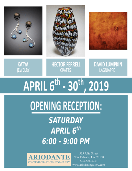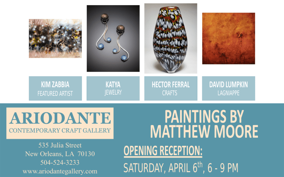Join us for an exhibition opening on April 6th from 6:00 p.m. - 9:00 p.m., in conjunction with the Arts District of New Orleans First Saturday Gallery Openings.