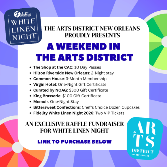 NEW ORLEANS (22 July 2025) – Arts District New Orleans (ADNO), the organization that founded the popular White Linen Night in 1994, is pleased to announce the 31st annual celebration of the event on 2 August 2025, in conjunction with their monthly First Saturday Gallery Openings. Fidelity Bank returns as the title sponsor of the event, which will take place from 5-10 pm on the 300-600 blocks of Julia Street in the New Orleans’ historic Warehouse Arts District. Guests are strongly encouraged to don their white linen while strolling the district, visit the galleries, enjoy food and drink from local vendors, and art-centered street activations.