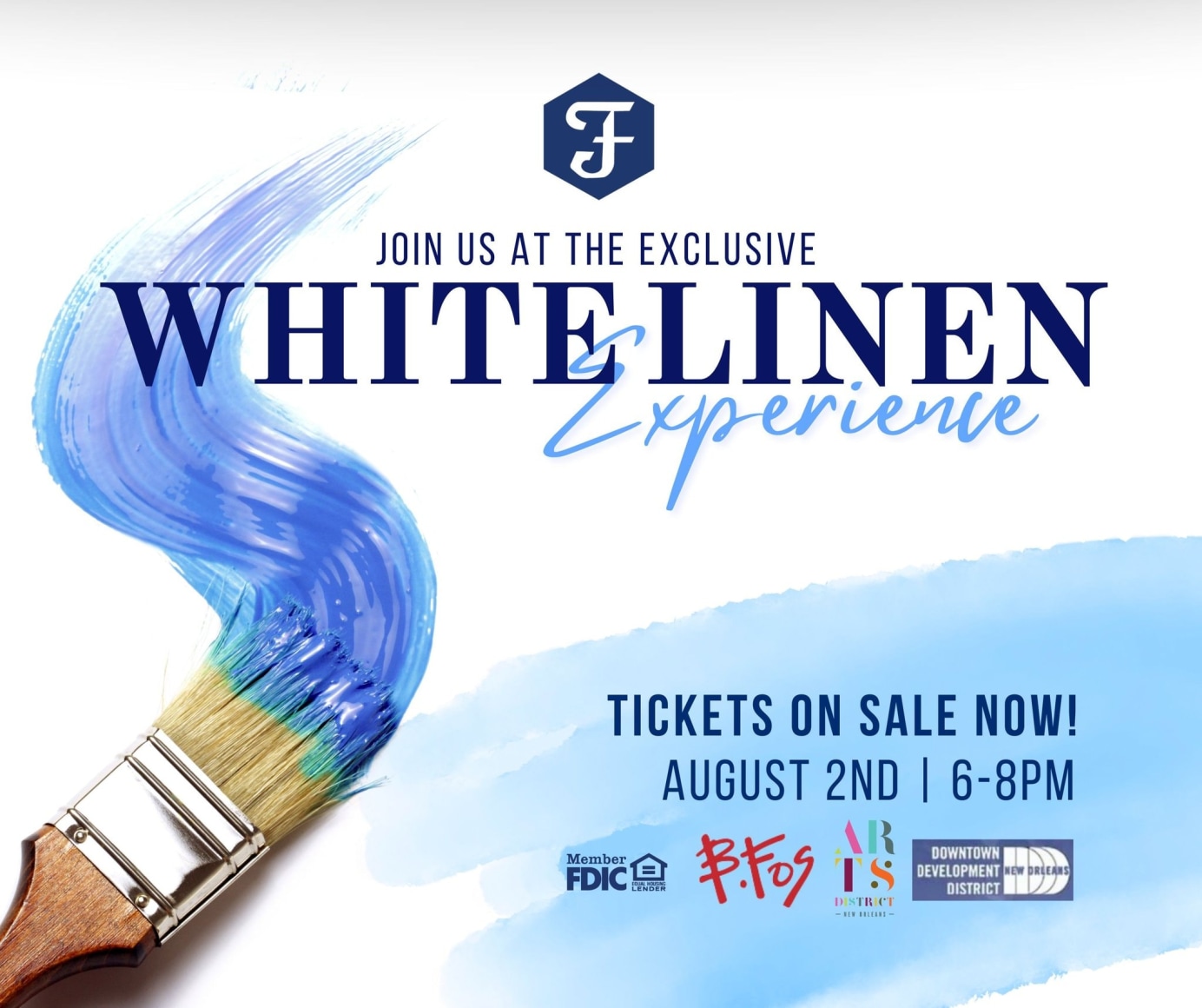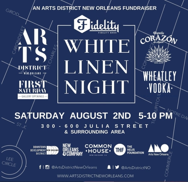 Chris Ferris, President and CEO of Fidelity Bank states: “White Linen Night is more than an evening of art and culture — it is a celebration of the creative spirit that makes New Orleans so vibrant and unique. Fidelity Bank is honored to once again stand with our community as the title sponsor of this summer tradition, inspiring all of us to support artists and local galleries not just one night but all through the year.”