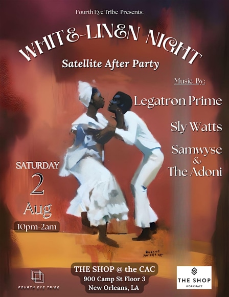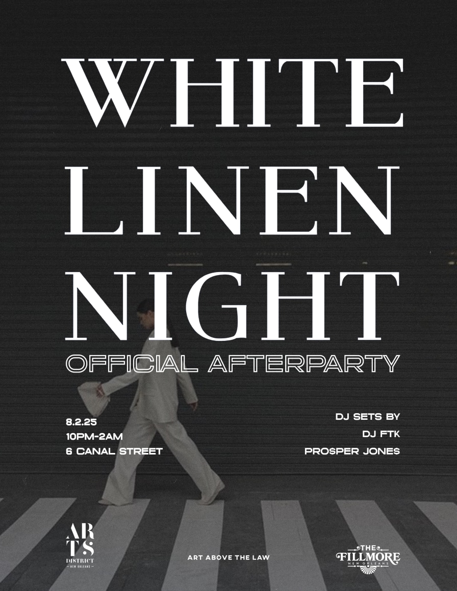 Join us at B.G's lounge located inside the Fillmore for the Official White Linen night after party ! Featuring Live D.J sets by DJ FTK and PRO$PER JONE$, raffles, special guests, crafted cocktails and more. Powered by Art Above The Law + Arts District of New Orleans.