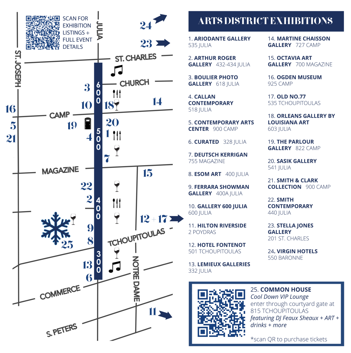 Each gallery will present new exhibitions, with world-class art installations from the talented artists represented. In addition to the Julia Street block party event, member galleries and businesses off-Julia will also welcome guests, and area institutions The Contemporary Arts Center (CAC) and The Ogden Museum of Southern Art will also open their doors and unveil new exhibitions including solo surveys and juried open calls of artists from the region.