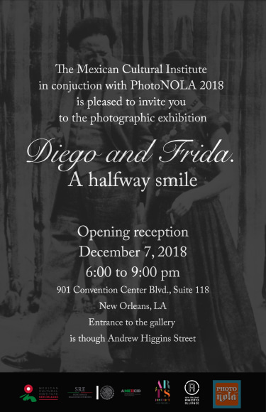 The Mexican Cultural Institute, in conjunction with PhotoNOLA 2018, is pleased to announce the photographic exhibition Diego and Frida, A Smile Halfway. This exhibition consists of personal photographs through which the wonderful world shared by Diego Rivera and Frida Kahlo is revealed. One of the most controversial couples in the history of art in Mexico, united for almost 25 years, their relationship is marked by an infinity of encounters and disagreements. This axis of love witnessed innumerable contacts, closeness, complicity and deep friendships with great personalities of the time. It is through the images captured by friends like Manuel Álvarez Bravo, Nicolas Murray and Edward Weston that different stages of the relationship, life, pain and death of Frida and Diego are presented.