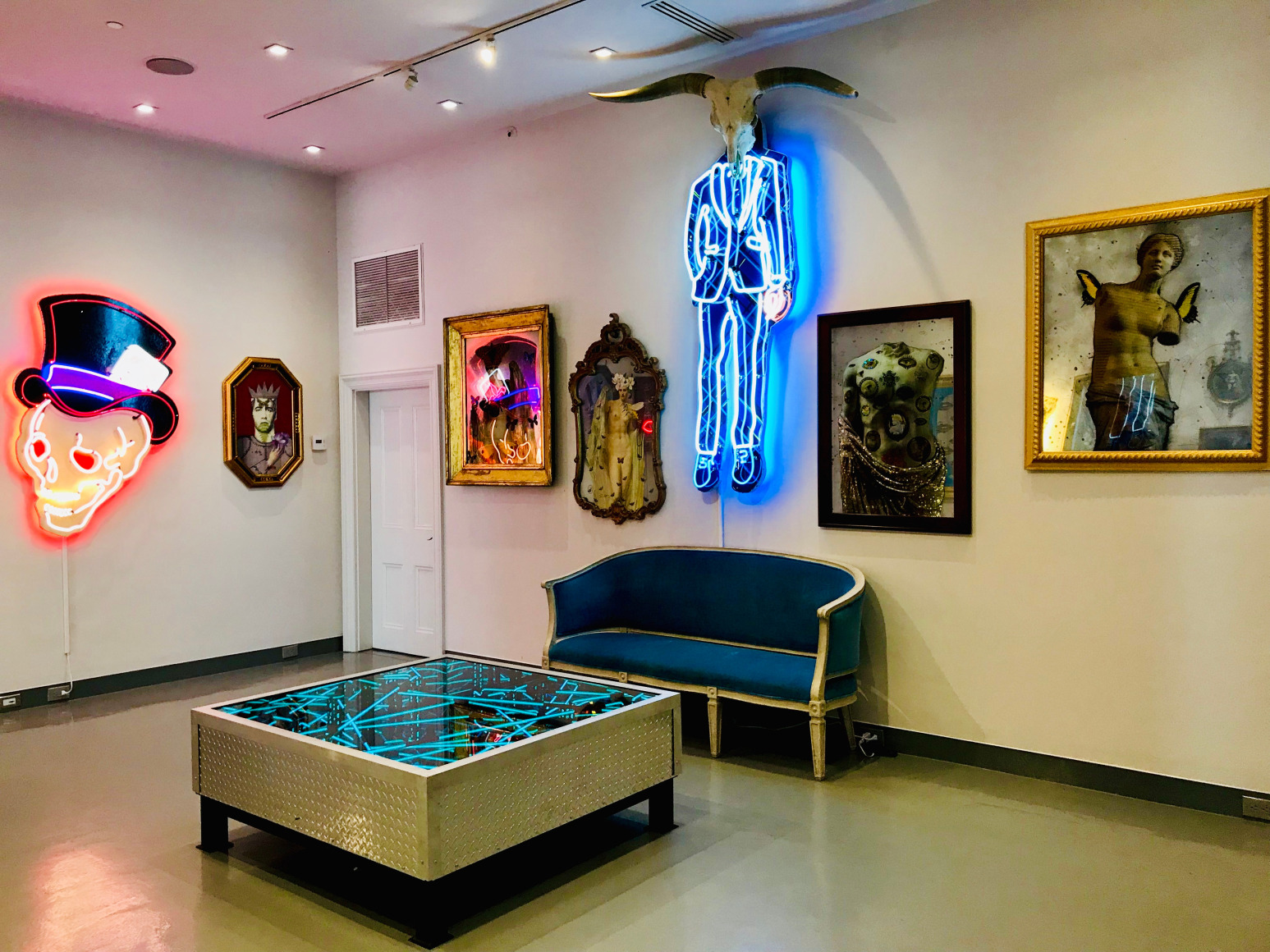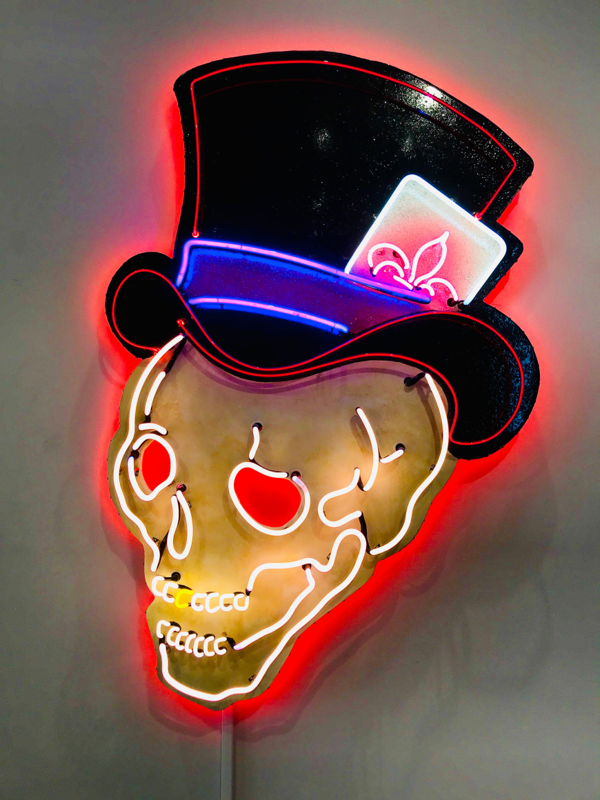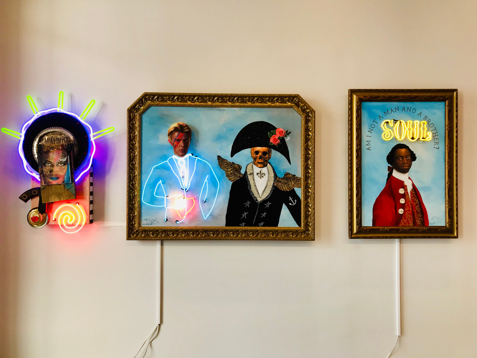 ALL THAT GLITTERS, New work by Louis St. Lewis & Nate Sheaffer, features an imaginative and totally fresh approach to the collision of fine art and neon. St. Lewis has been doing his thing in New Orleans since pre-Katrina, and has acquired an enthusiastic fanbase and inclusion in both the Ogden Museum of Southern Art and the New Orleans Museum of Art collections. As @gambitneworleans lauded, “An uncanny mix of sex, glamour, and antiquity, St. Lewis melds surrealist mystery with the pop pulsations of alternative rock.” Sheaffer is widely regarded as one of the leading neon fabricators in the south, with 30+ years of experience. When the two met and started not only collaborating but sharing a studio, things heated up quickly. The duo are considered one of LIVE NATIONS go-to creators, and their collaborative paintings at New Orleans’ Country Club on Louisa has converted many people to see the (neon) light.