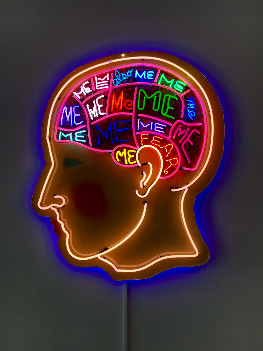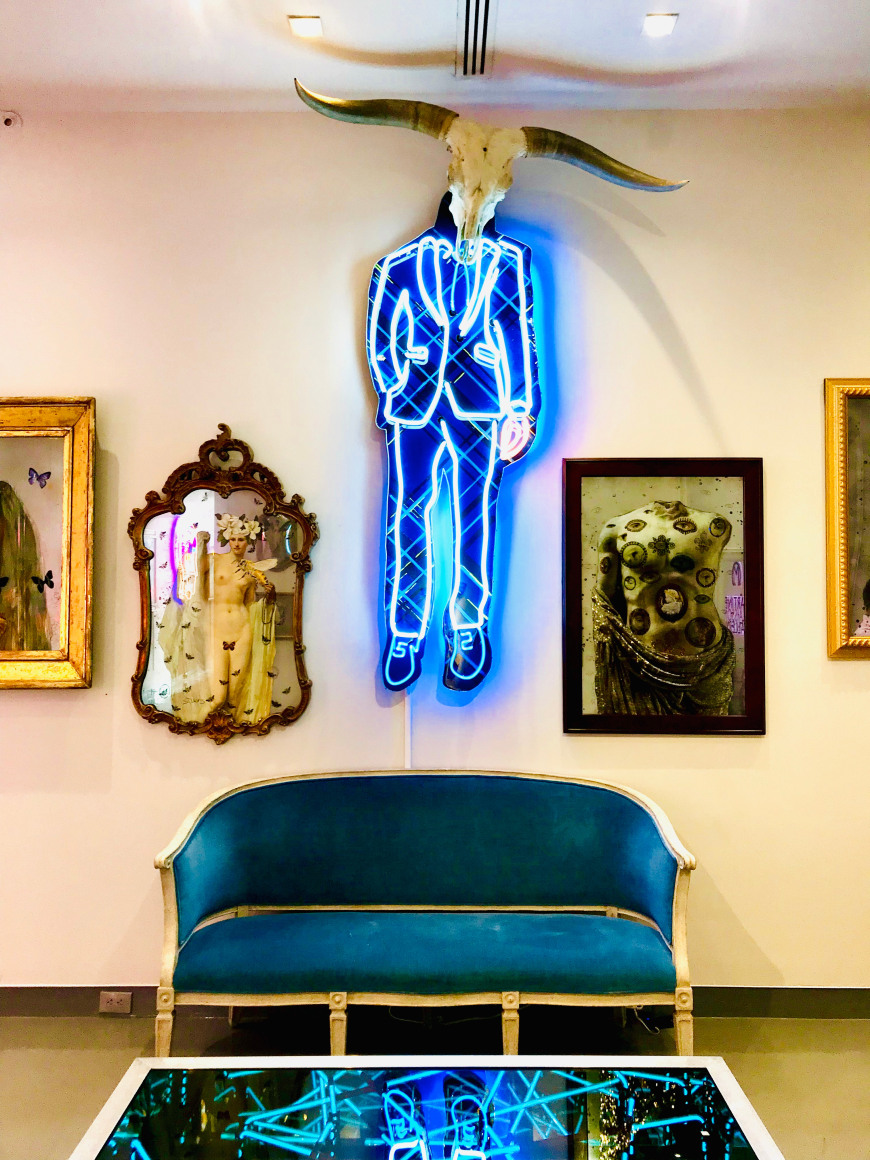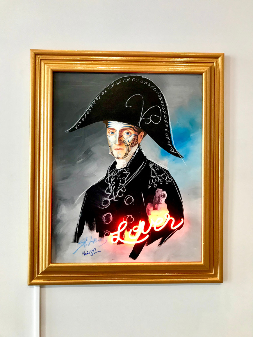 ALL THAT GLITTERS, New work by Louis St. Lewis & Nate Sheaffer, features an imaginative and totally fresh approach to the collision of fine art and neon. St. Lewis has been doing his thing in New Orleans since pre-Katrina, and has acquired an enthusiastic fanbase and inclusion in both the Ogden Museum of Southern Art and the New Orleans Museum of Art collections. As @gambitneworleans lauded, “An uncanny mix of sex, glamour, and antiquity, St. Lewis melds surrealist mystery with the pop pulsations of alternative rock.” Sheaffer is widely regarded as one of the leading neon fabricators in the south, with 30+ years of experience. When the two met and started not only collaborating but sharing a studio, things heated up quickly. The duo are considered one of LIVE NATIONS go-to creators, and their collaborative paintings at New Orleans’ Country Club on Louisa has converted many people to see the (neon) light.