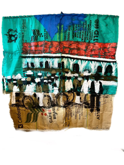 The paintings in the ‘Black Coffee’ exhibition are based on photographs taken by Brazilian photographer Marc Ferrez between 1882 and 1885 of coffee plantations in the Paraíba Valley. While Ferrez focused on making Brazil look like a cornerstone of world production, due to slavery, he minimized the people in the photographs presenting a “pacified slave”. The people enslaved in the photographs took their power through posing with their families and the gaze they laid upon the photographer. Walker brings this power into the “Black Coffee” paintings.
