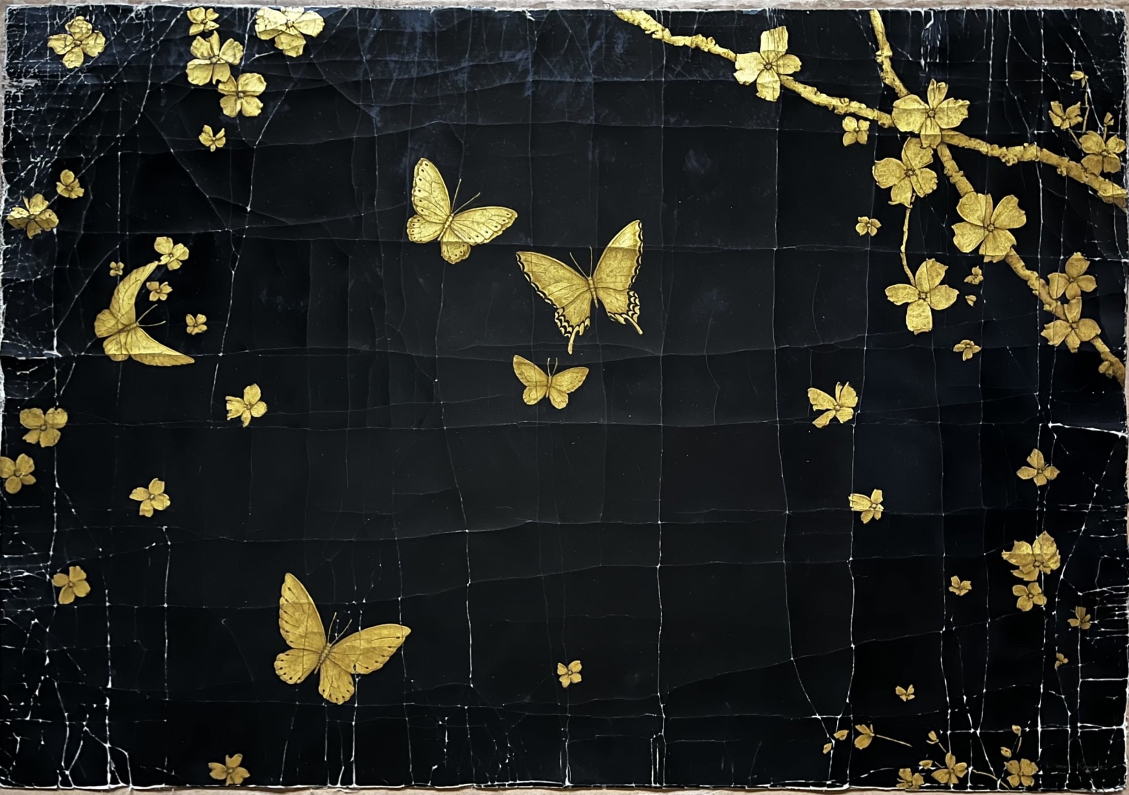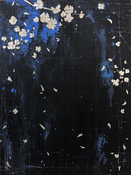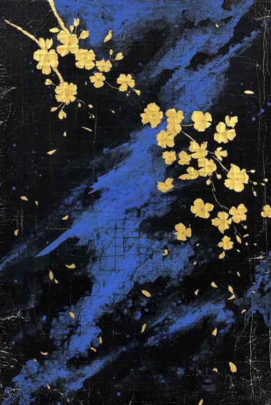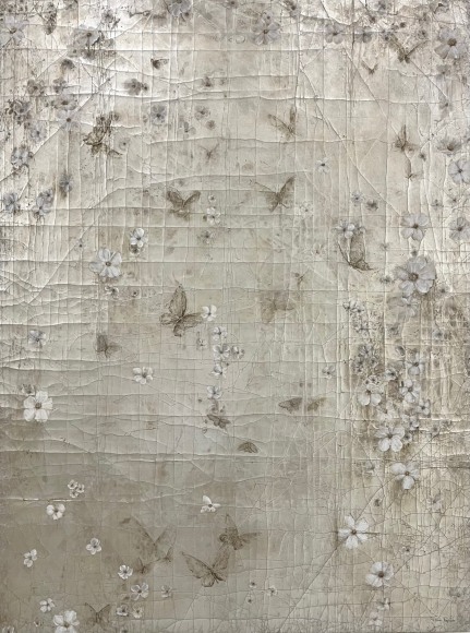 Her process to paint modern Chinoiserie and floral art is unique and laborious, working with various layers applied to fabric, and often with precious metals, to create her own canvas. She has transformed the ancient styles of painting into contemporary applications, while pushing the boundaries of traditional gilding methods to create modern works of art. Nurturing each piece from conception to the natural form it takes on, she embraces its imperfections and builds on each piece’s individual footprint of fractures, making her art distinctive and collectible.