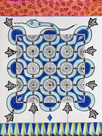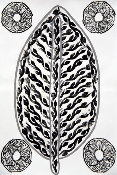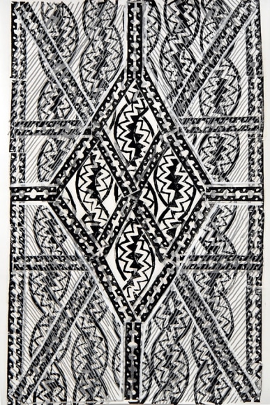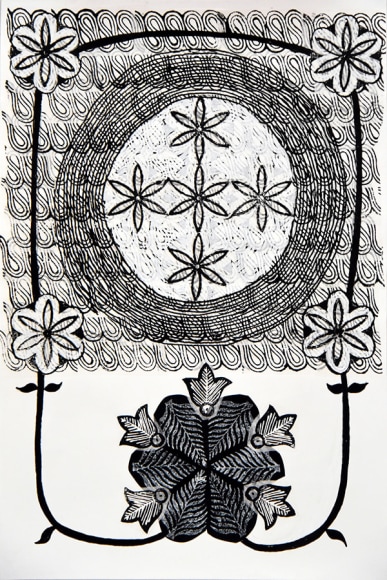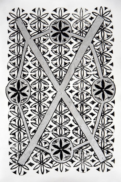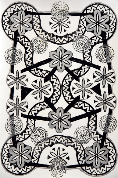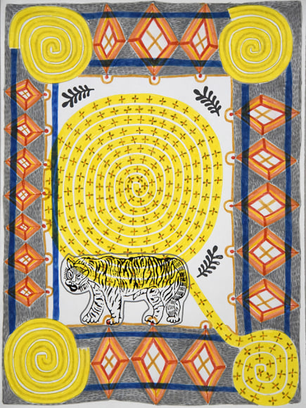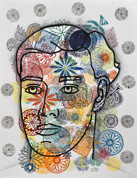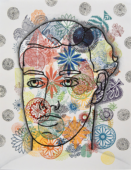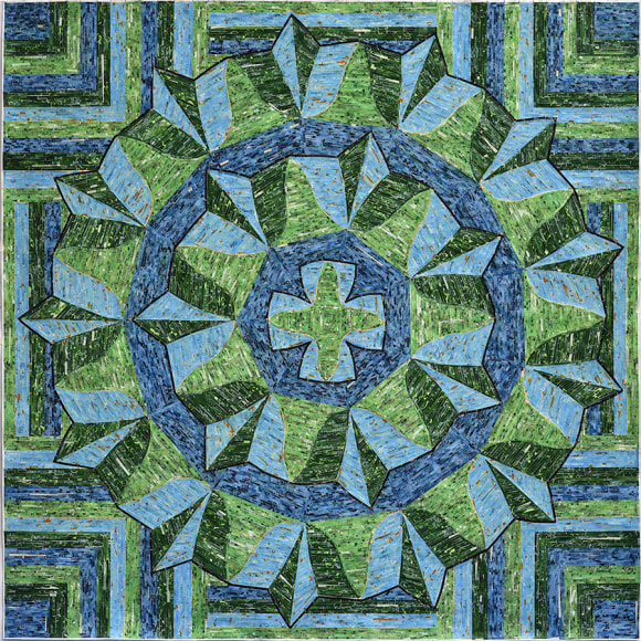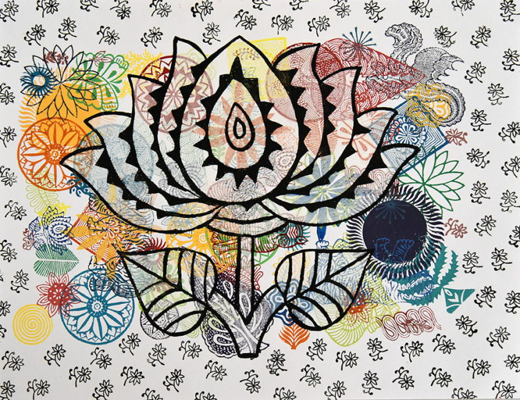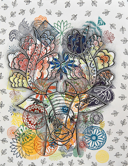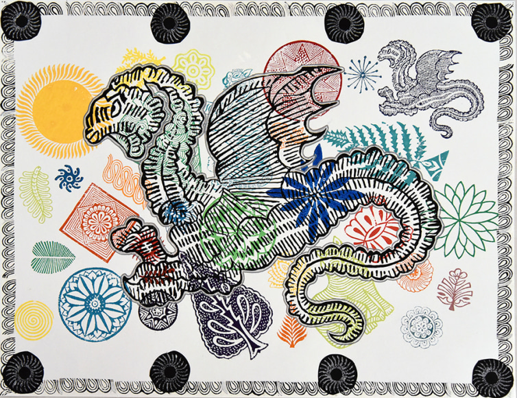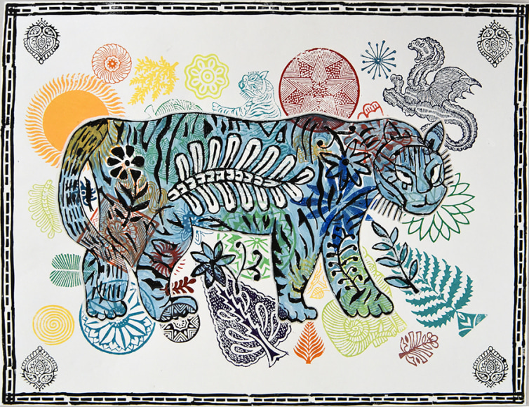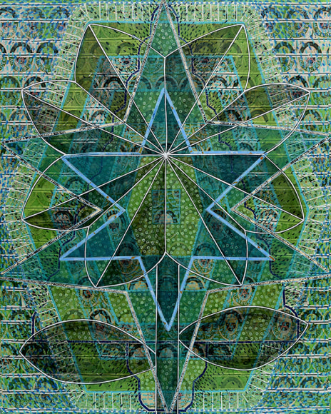 The recent work is made from painted and block-printed papers. Motifs and shapes are printed in a repeating fashion combined with layered painting techniques to create all-over patterns that are shredded into small strips. The same forms are carefully printed row by row creating hundreds of recognizable, individual forms that are carefully cut out. Together strips and shapes are arranged using repetition and intuition guided by original designs that explore the infinite possibilities of radial form, symmetry, and pattern.