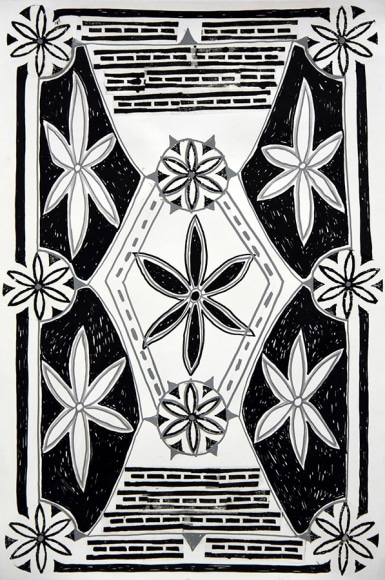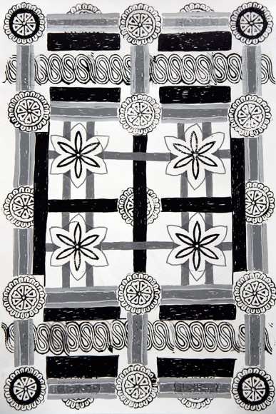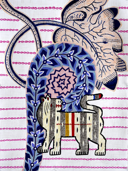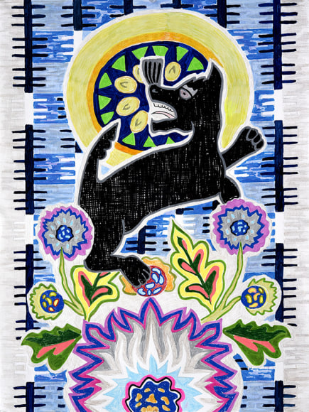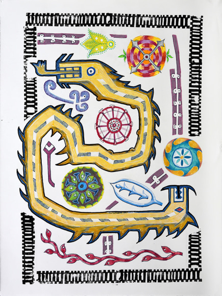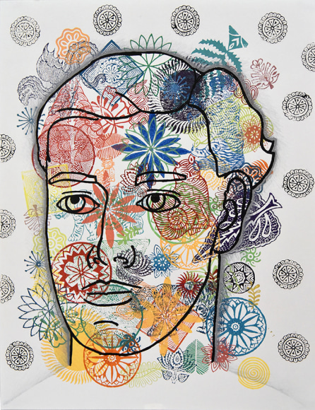 Acrylic, paint pens, acrylic on paper mounted to canvas