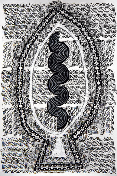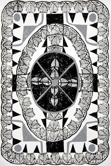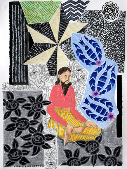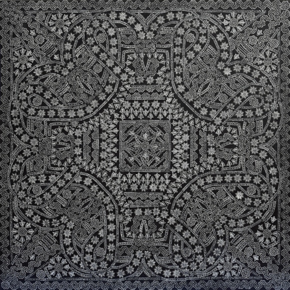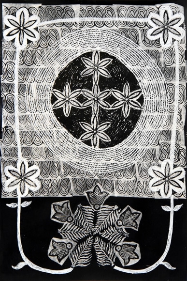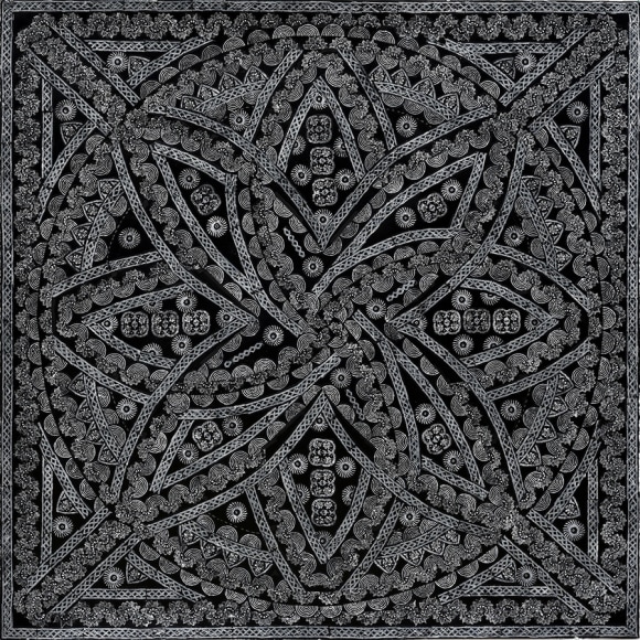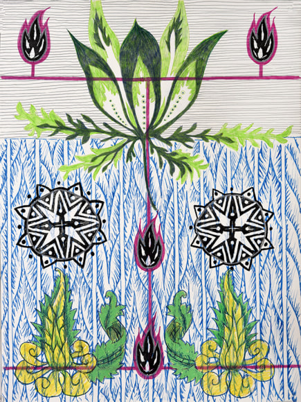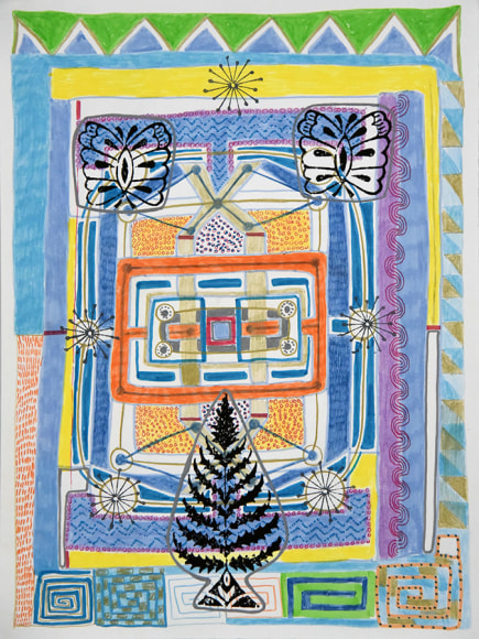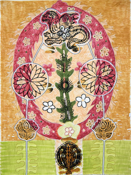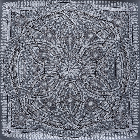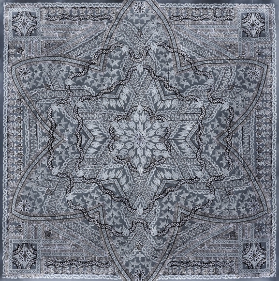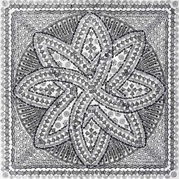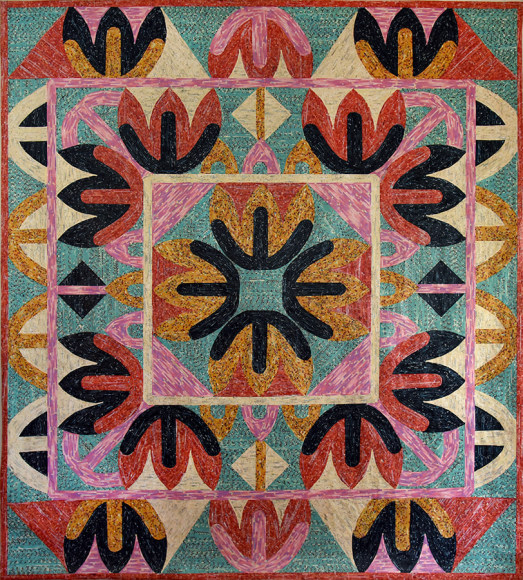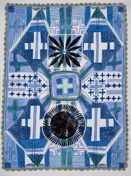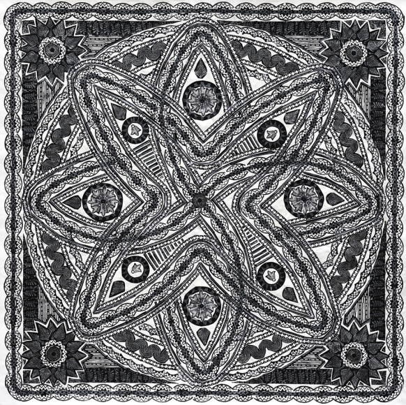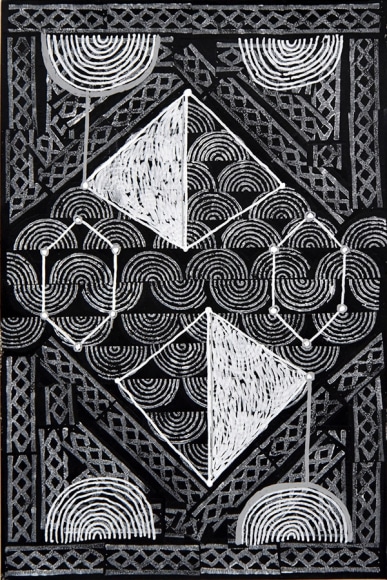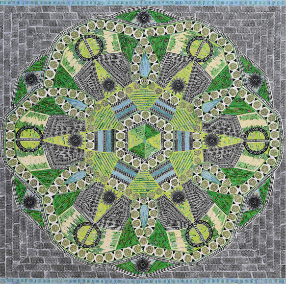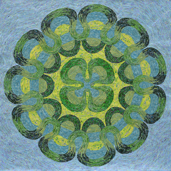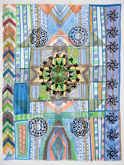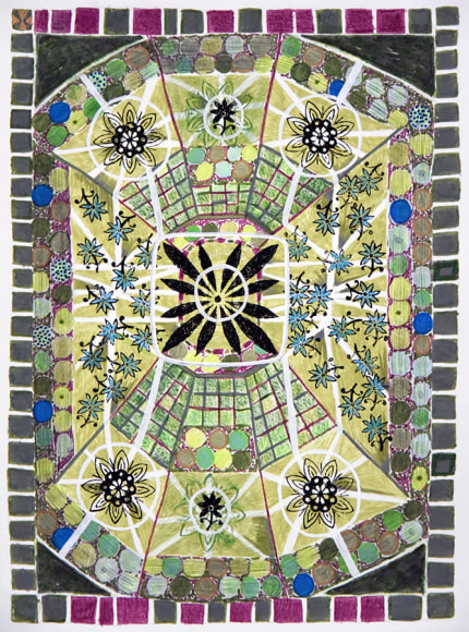 Exploring symmetrical and radial drawings requires concentration and meditation. The lines divide the two-dimensional space and become mystical and alchemical maps used to guide the placement of marks, symbols, lines, texture, color, and pattern. Focused awareness and openness to this map help make critical decisions as the work develops.