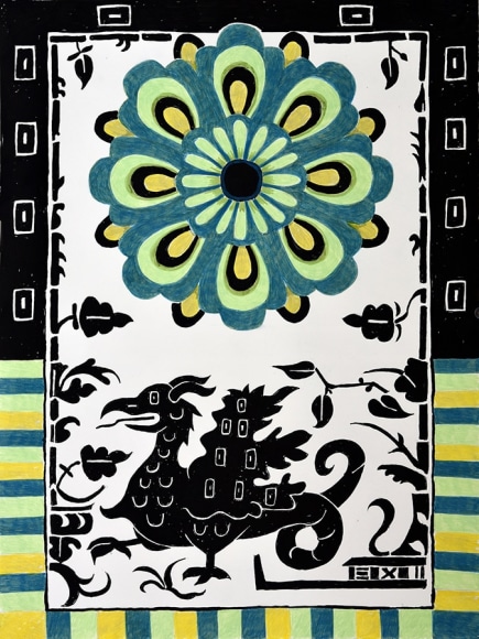 Occasional figurative compositions of men, flowers, or animals create levity in the overall work. They are made using the same collage technique and materials and are elevated to a heightened stylization. They provide a different kind of map that is less assertive and organized and suggest a primitive otherworldliness and pathos.