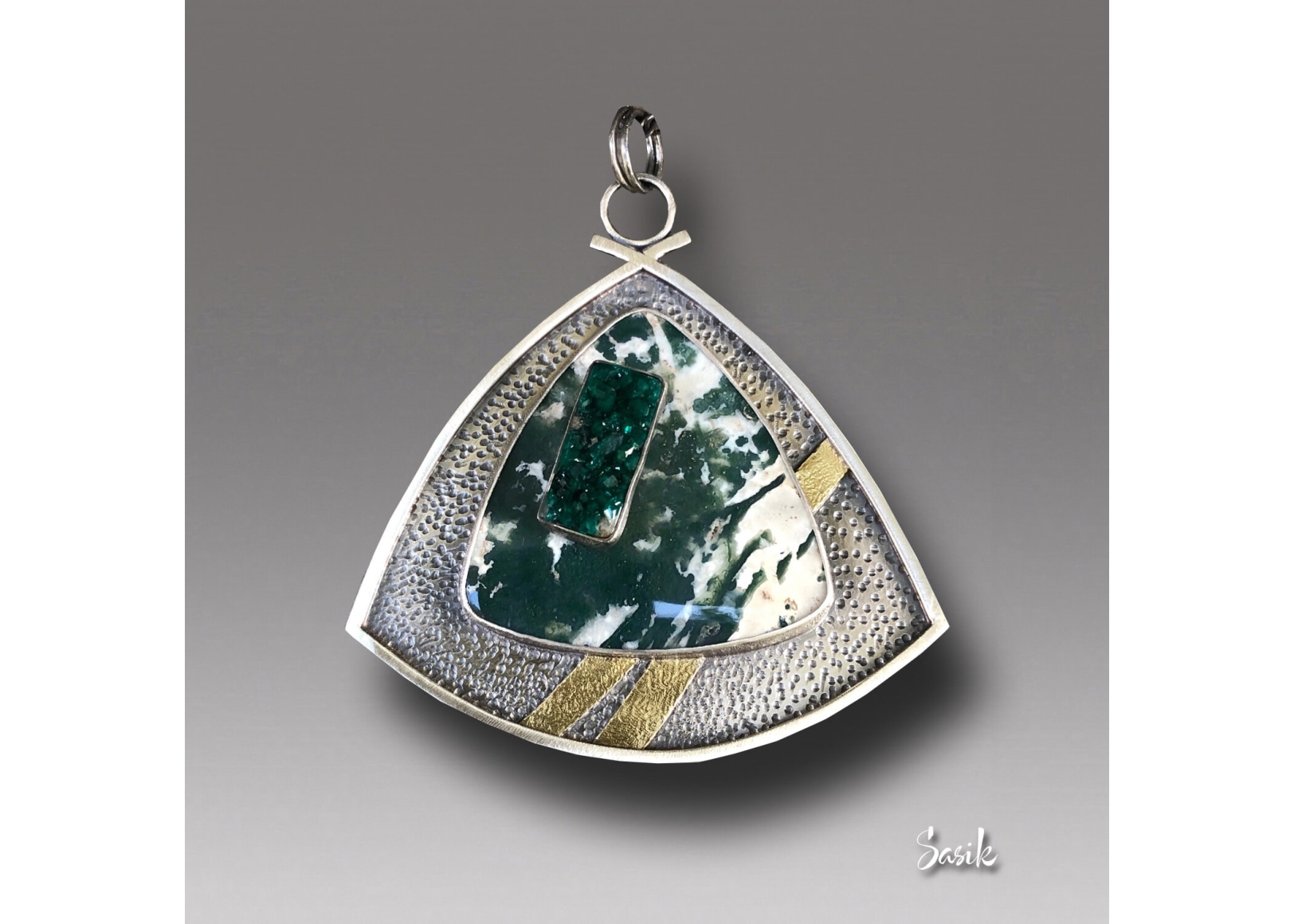 Sasik, Sterling Silver. Apple Valley Agate, 18K, Dioptase Druzy, 2020