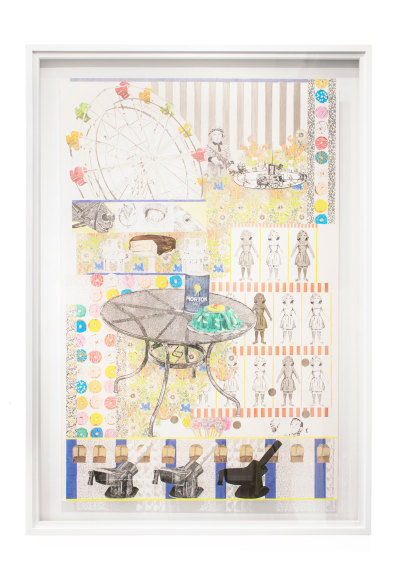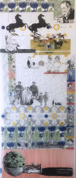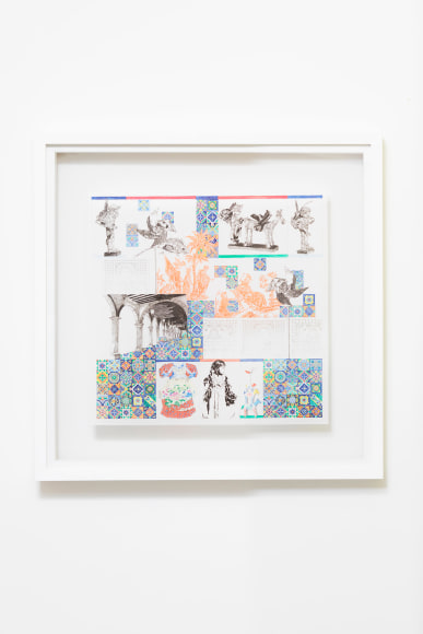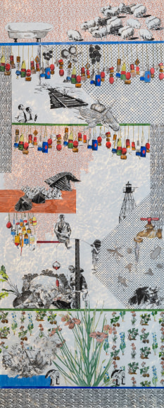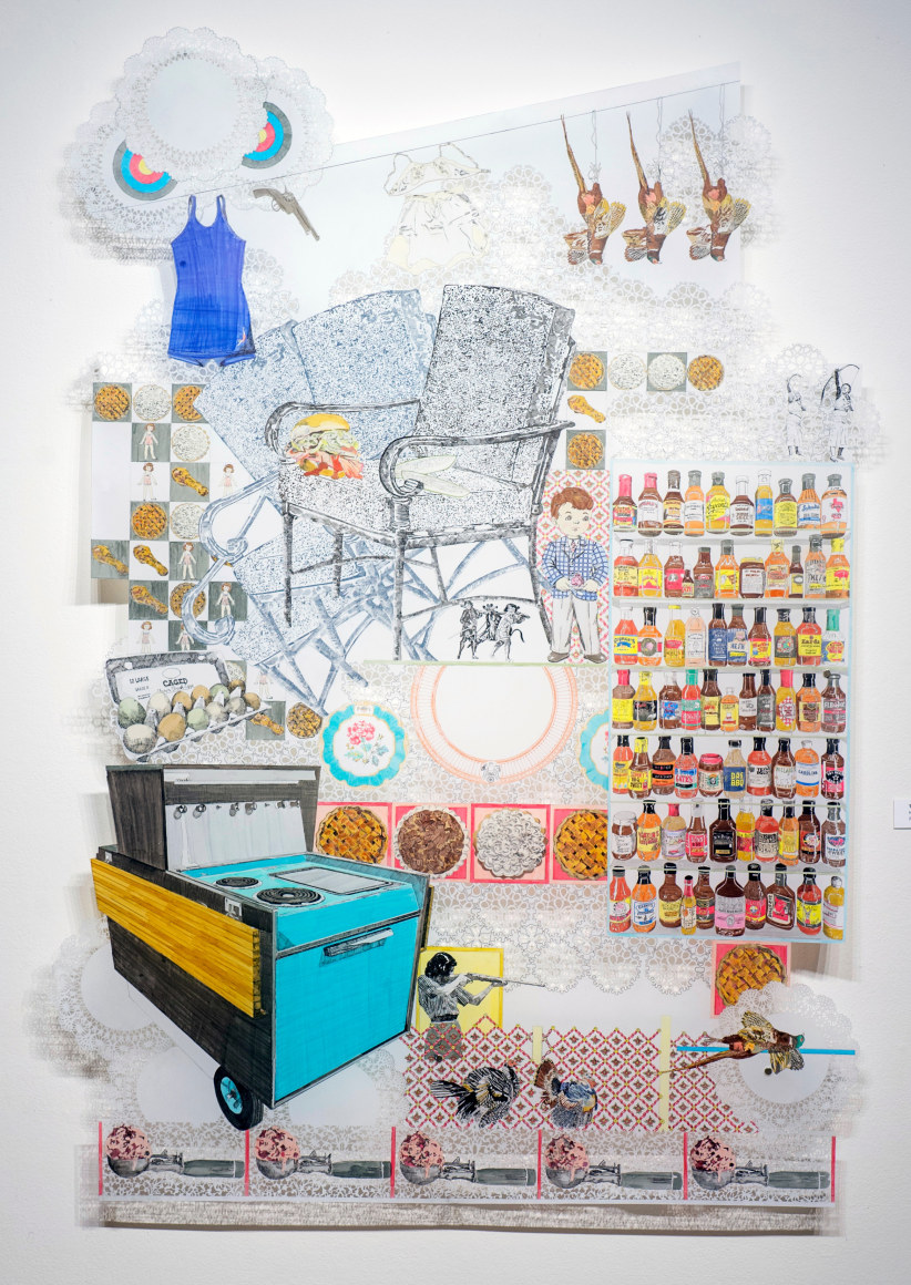 Through a combination of appropriated and invented imagery, my work contextually constructs contemporary accounts of systemic marginalization, executed under the guise of leisure, embellishment and luxury. The dense visual language invites investigation into the textured surfaces and leads the viewer to reflect on the social textures of contemporary culture while questioning their own complicity in current social constructs. Sourcing from period- specific textiles, turn-of-the-century advertisements, campaign posters, and found family photographs, the collaged images create a singular narrative composition that document the cyclical and systemic nature of marginalization in America. The methodology with which the drawings are constructed echoes historical layers of rules, regulations and hierarchies that are stitched into dominant white American myths. The resulting drawings are indexical in nature, recording the parallels between topics of current debate and 18th century Western expansionism.