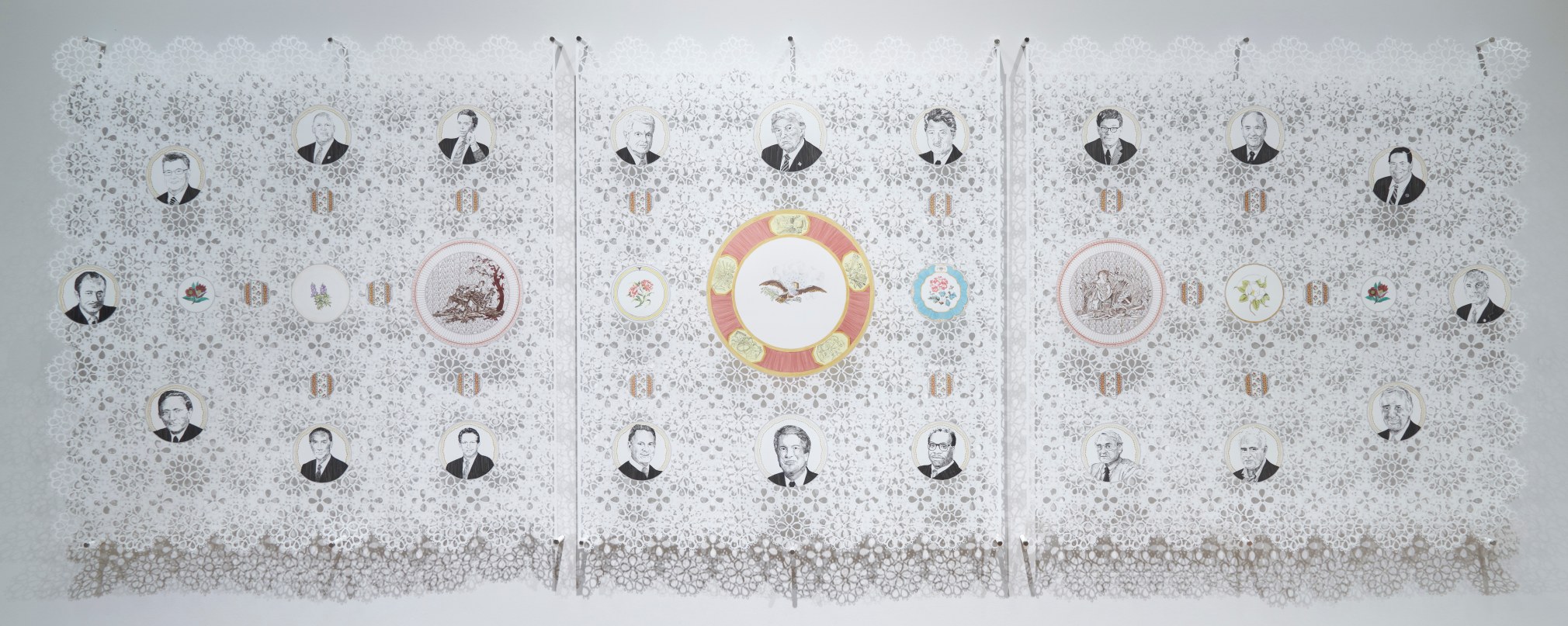 Firmly grounded in America’s expansive colonial history, my work interrogates how Southern culture has been idealized as “quintessential America” and the bedrock of traditional American values. My drawings act as a visual archive of research that examines the consequences of American colonialism and addresses the sense of white fragility that continues to pervade Western culture. In the midst of widespread anxiety over the collective American identity, there has been a revival of many of the country’s unresolved historical battles, including contentious race relations, sexism, nativism, and an ever-growing wage gap. I employ the Americana aesthetic of the old South to parallel historical and contemporary acts of resistance to racial, economic, and gender diversity. Borrowing directly from the decorative arts, the meticulously hand-cut mylar and equally intricate drawing capitalizes on America’s propensity for nostalgia to lure the viewer into confronting injustices through the detached lens of that which has already happened.