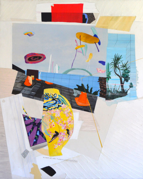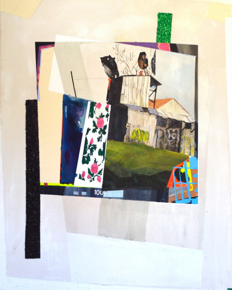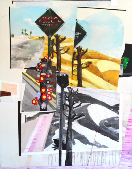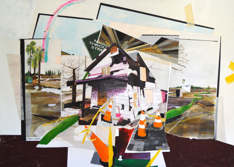 Wallpaper from a childhood bedroom shows up, images lifted from other artists on Instagram, video-game monsters. Disaster photos, shared, liked, validated. Signs reoccur, the most straightforward of signifiers. Text, jumbled, cut off, weaves in and out of the paintings. Abandoned buildings still dominate, a long-held touchstone in my work, but they fight for canvas with a cacophony of other "places".