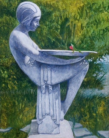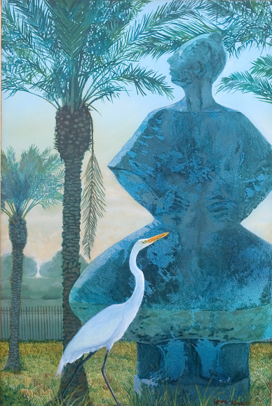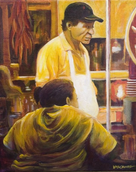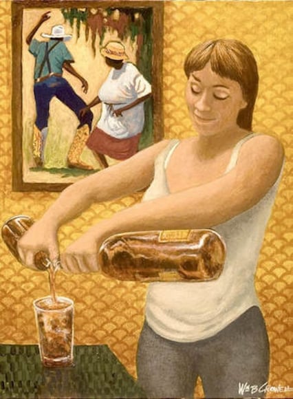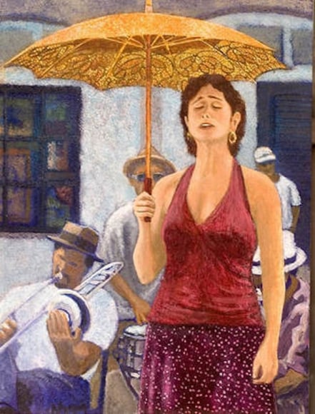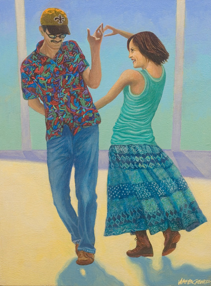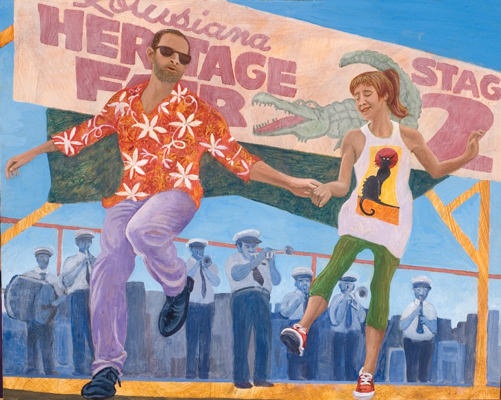 Crowell is an acrylic artist who often delights in a wry presentation of genre scenes, inspired by New Orleans culture. His background as a mechanical designer accounts for his clean-edged approach to painting.