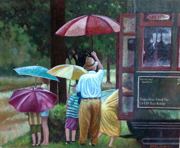 Kenney, who was the Director of Art and Graphic Design at the Audubon Institute, has a straightforward interpretation of urban realism. Her palette is too bright or occasionally pastel to truly mimic the often melancholy vision of Edward Hopper, but the analogy is clear.