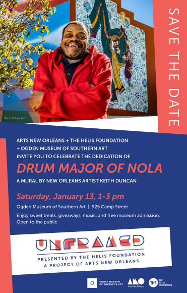 Major drum roll, please! Join us as we celebrate the dedication of Drum Major of Nola, the latest installment of New Orleans’ signature multi mural collection, Unframed presented by The Helis Foundation, a project of Arts New Orleans.