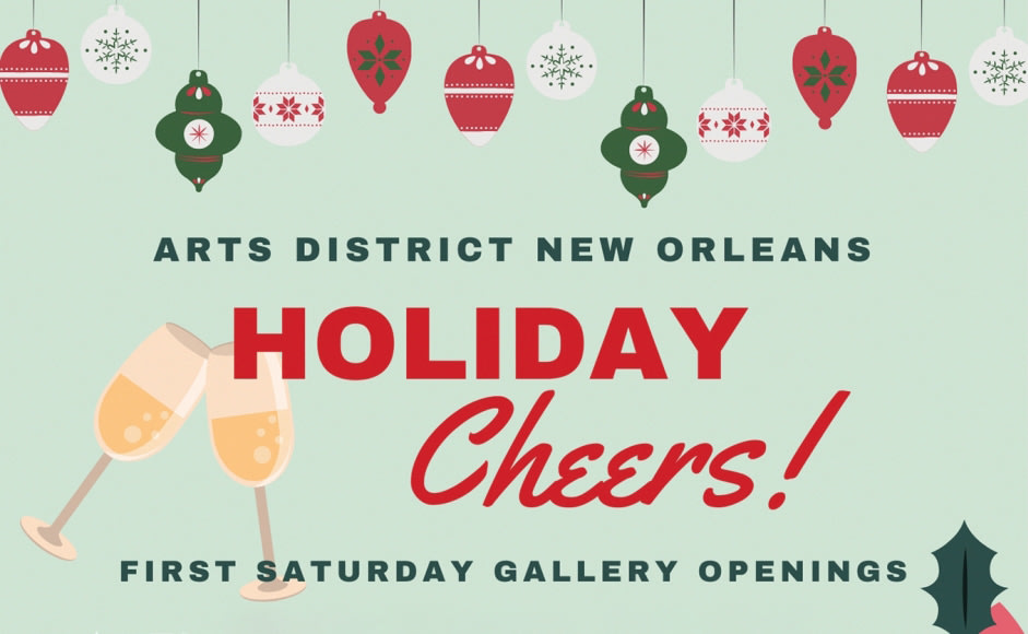 NEW ORLEANS, LA (November 2021) – Arts District New Orleans (ADNO) is pleased to announce Holiday Cheers, a holiday art walk in the district to coincide with the First Saturday gallery openings on 4 December 2021 from 6-8 PM.