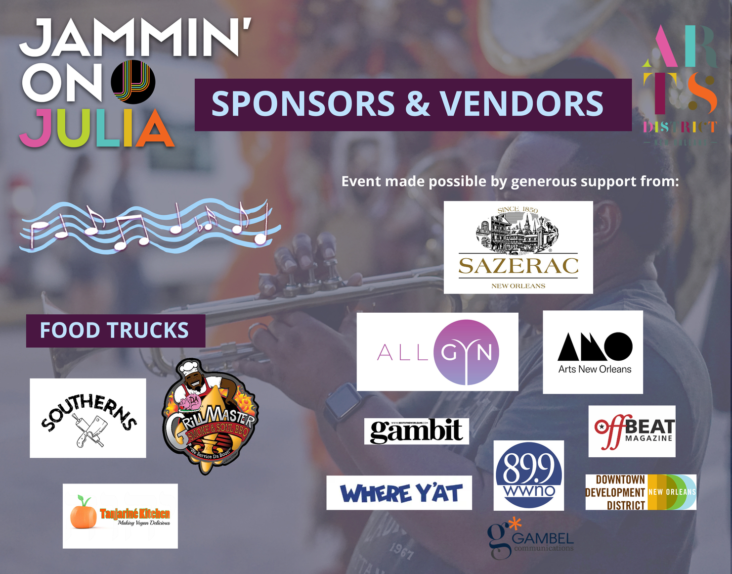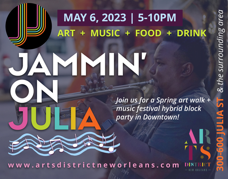 Arts District New Orleans (ADNO) is pleased to announce the return of Jammin' on Julia, a Spring art walk + music festival hybrid event in the district. Jammin' coincides with the First Saturday gallery openings on May 6th, from 5-10PM. In addition to the art walk, the district welcomes patrons to an evening block party featuring world class art exhibitions along Julia Street and the surrounding area, with musical performances in select galleries on Julia, Camp, and Magazine Streets, and food trucks & bars on the closed 300-600 blocks of Julia. The event is free and open to the public and is a perfect opportunity to stroll through the historic Arts District and discover New Orleans’ contemporary art, music, and cuisine.