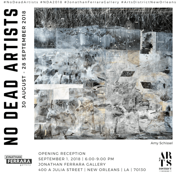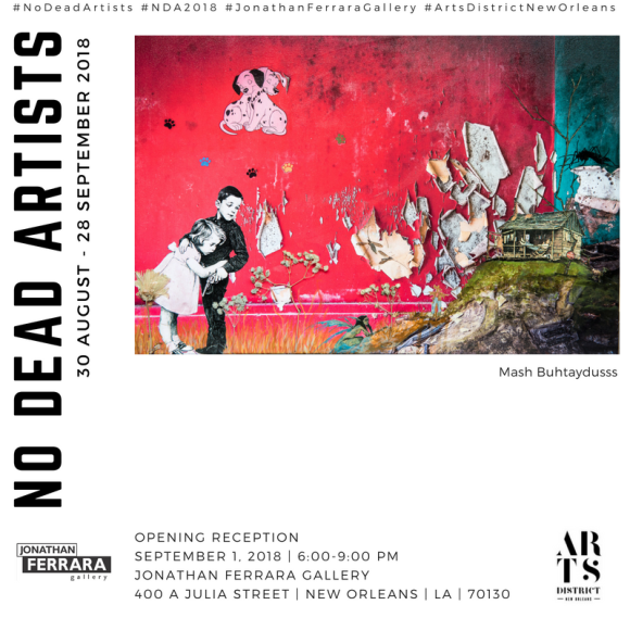 The NO DEAD ARTISTS exhibition was founded by Jonathan Ferrara in 1995 to give a voice to emerging artists. The exhibition's name is derived from the old adage that artists never achieve success until they are dead. NO DEAD ARTISTSturns that notion on its head and often gives emerging artists their first break in the art world. In the 90's, the exhibition was open to New Orleans-based artists and subsequently grew to include artists of Louisiana, then becoming a national juried exhibition in 2010. And in 2014, the exhibition went international. Now in its 22nd iteration, the exhibition has been a springboard for numerous artists; leading to national press coverage, recognition, gallery representation and acquisitions by museums and other prominent collections.