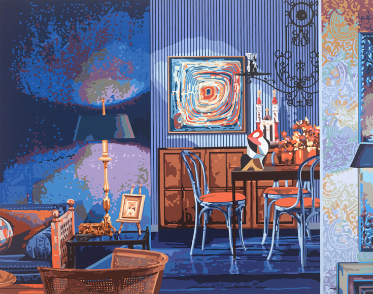 All the Way Home is Jim Richard’s tenth exhibition with the gallery. Featured are small- to large-scale works rendered in Flashé on canvas, linen, and Yupo paper. The works, created over the last few years, continue the artist’s remarkable series of paintings that depict high style domestic interiors flecked with period furniture, kitsch objects, and works of art usually with a modernist flavor. Also included are paintings that depict gardens or backyards that are inhabited with (and interrupted by) references to modern art with the paint either applied by brush or a new poured technique.