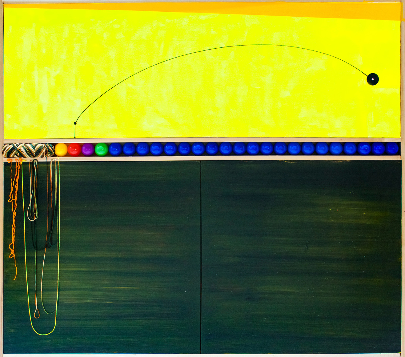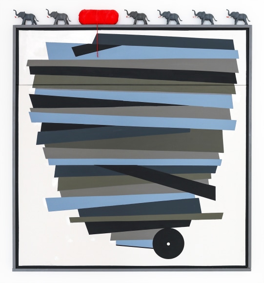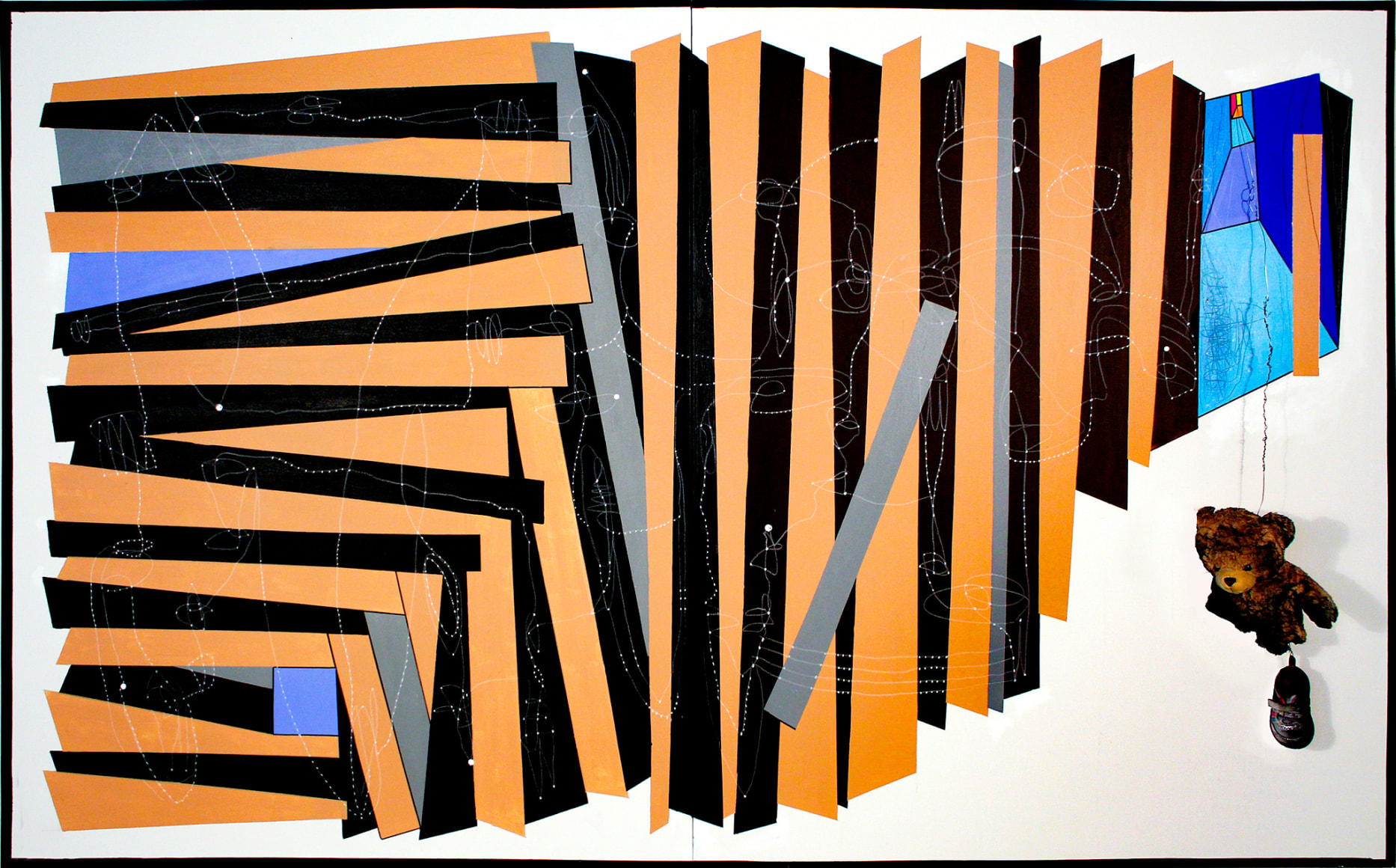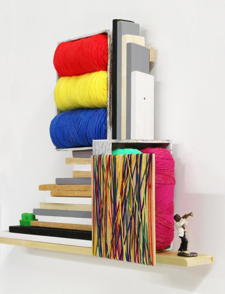 incorporates toys, yarn, and found objects in some of the pieces to help visually represent migration and tell