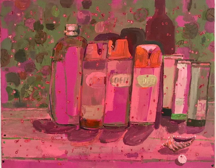 Deep Woods is a show named for a bug spray but also asks questions about the depth of our interface with the natural world. The ceramics and paintings are inspired by personal interactions with people and places in the natural world. The ceramic pieces are functional flower vases and drinking vessels that are facsimiles of the things we use to insulate our body against external and internal discomfort: bug spray, sunscreen and alcohol. I think of these bottles as future fossils. They are made to look like they have been excavated from a landfill. Their surfaces sport a sunbaked patina and are experiencing a second growth as flora has begun to overtake the calcified surfaces of their former plastic armor.