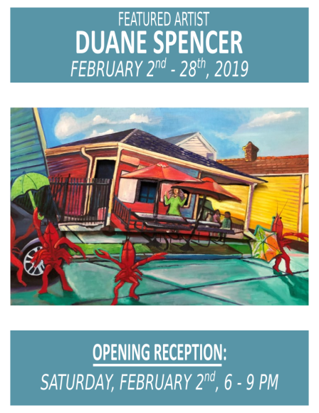 We will have an opening reception from 6:00 p.m. - 9:00 p.m on February 2, 2019 in conjunction with the Arts District Association of New Orleans' First Saturday Gallery Openings.