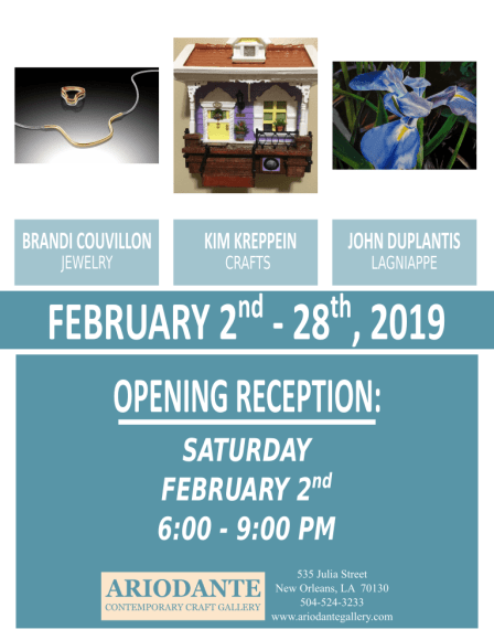 Ariodante Contemporary Crafts Gallery is pleased to announce our exhibition featuring artists Duane Spencer, John Duplantis, Brandi Couvillon, and Kim Krepein. This exhibition will run from February 2, 2019 - February 28, 2019.
