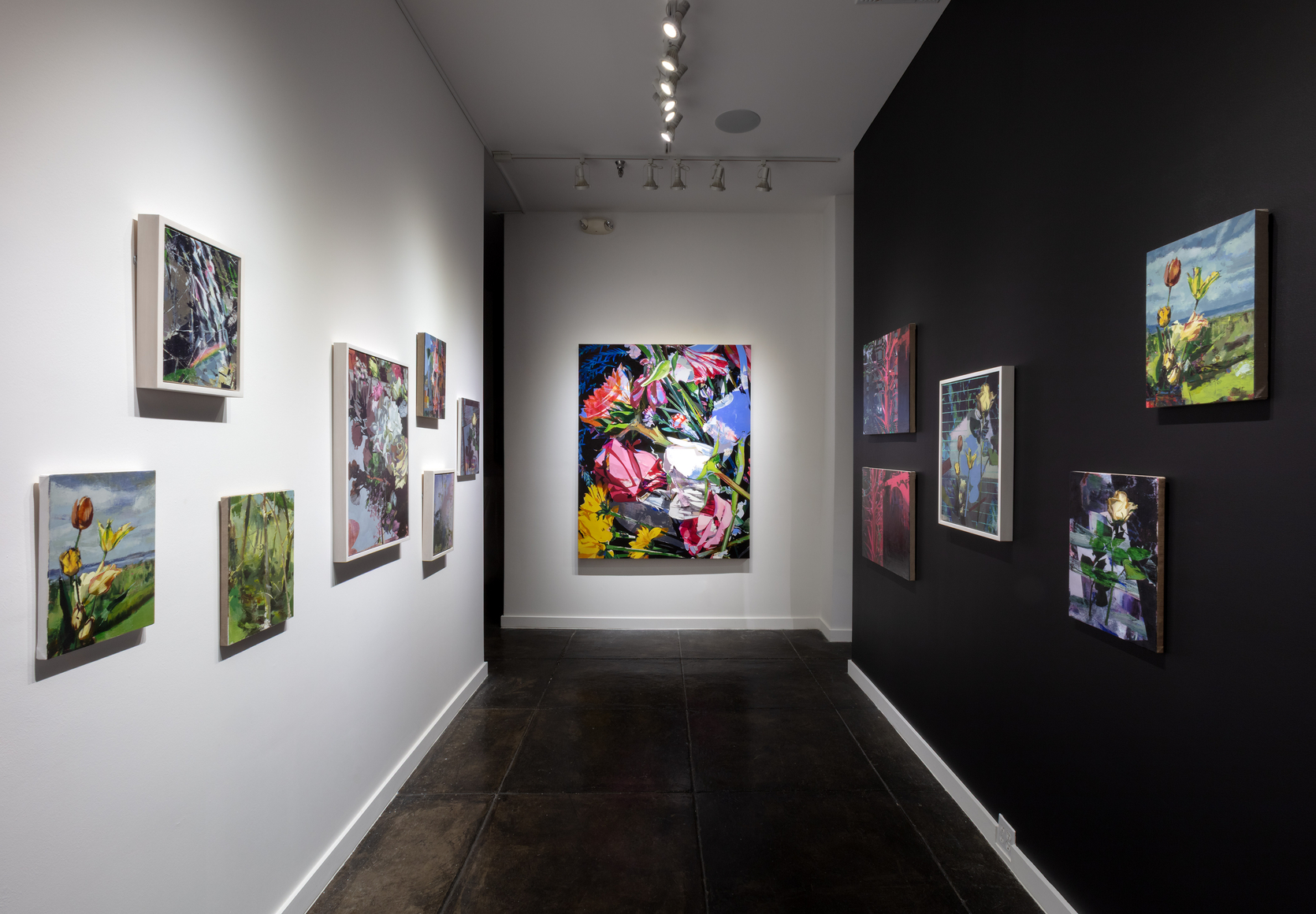 These paintings inhabit the genre of nature morte and landscape, concentrating on what it might mean to depict an object (flower) or a setting. We have all had the impulse to take a photo of a sunset, fall colors on a tree, or a prismatic waterfall. We record these images out of an innate sense of beauty. When we wonder at the existence of the vista or nature before us, we reflexively wonder at our own existence. The sunset and the flower are a mirror showing us who we are and what can be. Painting searches for the sympathetic form ready for the eye’s haptic touch to reveal. We can love, and we can mourn, but the algorithm cannot.