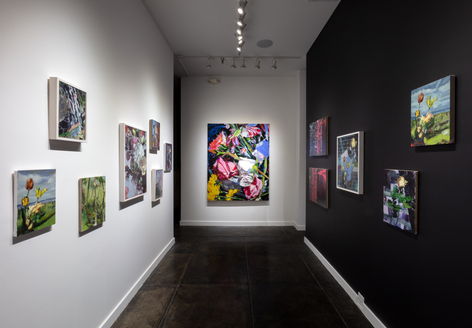 These paintings inhabit the genre of nature morte and landscape, concentrating on what it might mean to depict an object (flower) or a setting. We have all had the impulse to take a photo of a sunset, fall colors on a tree, or a prismatic waterfall. We record these images out of an innate sense of beauty. When we wonder at the existence of the vista or nature before us, we reflexively wonder at our own existence. The sunset and the flower are a mirror showing us who we are and what can be. Painting searches for the sympathetic form ready for the eye’s haptic touch to reveal. We can love, and we can mourn, but the algorithm cannot.