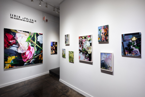 The exhibition surveys fifteen new and recent paintings in the artist’s ongoing exploration in perceptions of nature through the intervention of technological forces. The imagery grows from images of flowers, thick forests, sun-dappled foliage, and birds; evoking wonder and depicting natural beauty, complexity, and immensity. These images catalyze the paintings, as the artistic process evolves a matrix. Digital lenses, scanners, glowing screens, glossy plastics, degraded photographs, and gridded weaving patterns provide a reservoir of visual artifacts that are used to transform these images of nature. Sprecher filters and re-formats, echoing one’s daily experience mediated through technology. The underlying irregular grid creates a push and pull, as flowers and leaves emerge yet are pulled back into the flickering tangle, creating a discordant reality, a place of wonder and dread.
