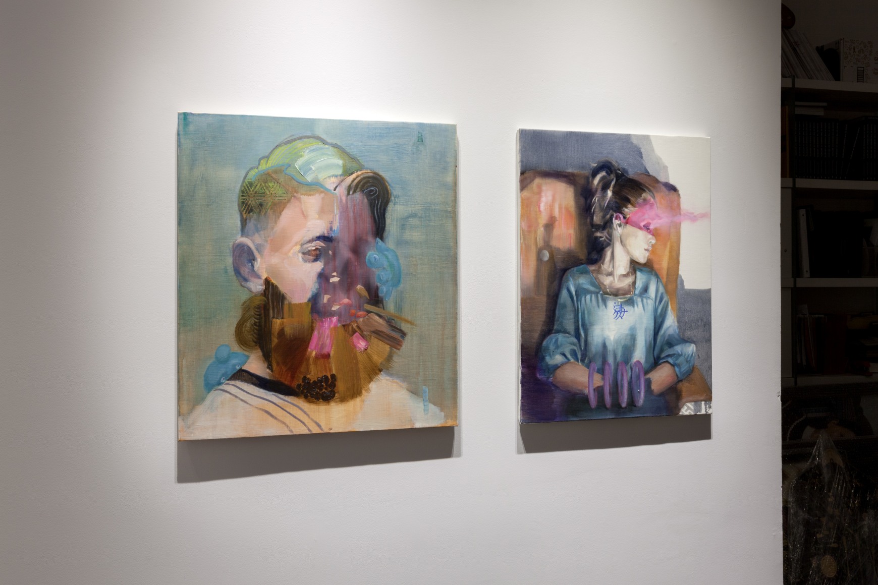 I want to draw viewers into the imagination of these paintings by depicting characters that represent various modern-day questions such as: Are we alive or dead? What is gender? Are humans something else? Real or virtual? At the same time, I also want to push viewers back into reality through the inclusion of blank spaces and the arrangement of actual materials in various places around the canvas.