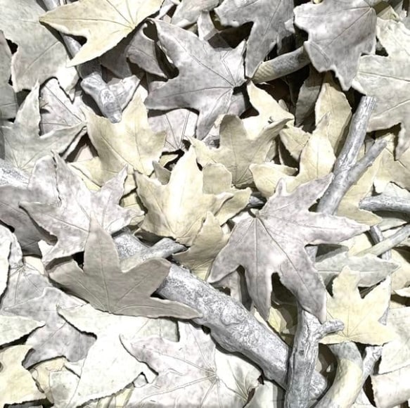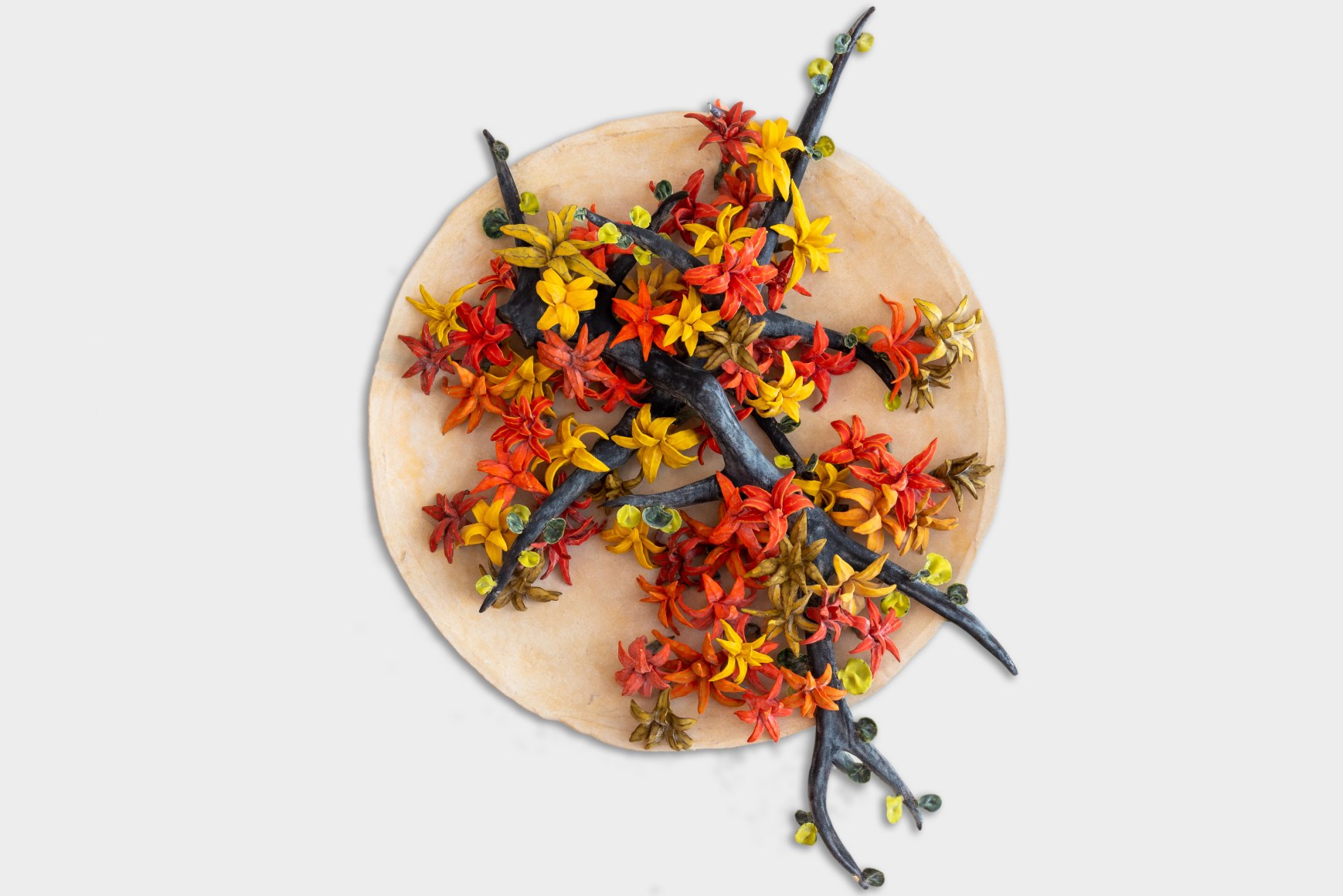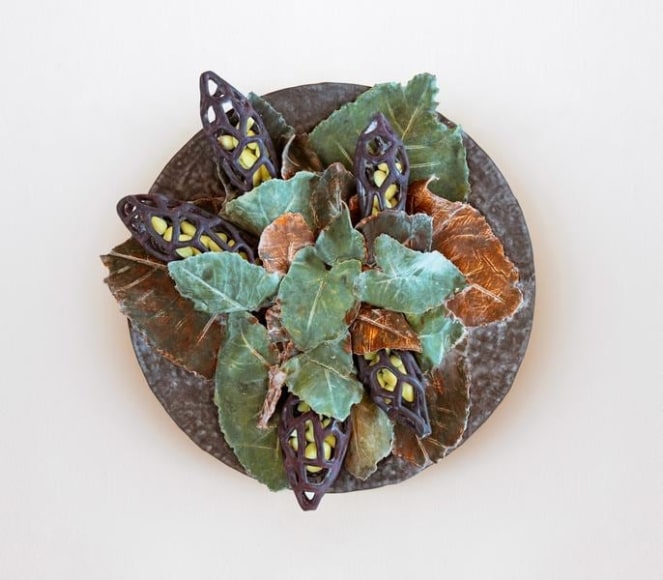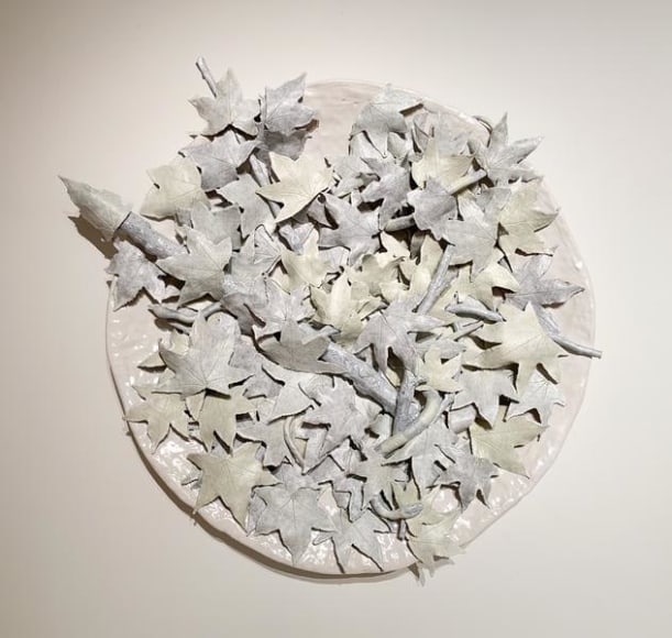 Tantalizingly familiar and yet not, but neither fostering the discomfort of the uncanny, their repetition—thousands of flowers, a forest floor’s worth of leaves—are in fact marked with deliberate permutations of uniqueness, engendering a sense of vulnerability. They cultivate longing—for connection, for touch, for protection, but also the desire to provide for and to nourish. That is because each form is the product of an embrace, each smooth surface a soothing caress, each indentation the gentle pressure of a fingertip. And then, these cultivated shapes are lavishly drenched in glazes of such depth and complexity, whether sugary, milky, deeply glossy, or like molten metal, with color and texture reiterating their compositional relationships and then creating new ones. These are forms, literally, of nurture.