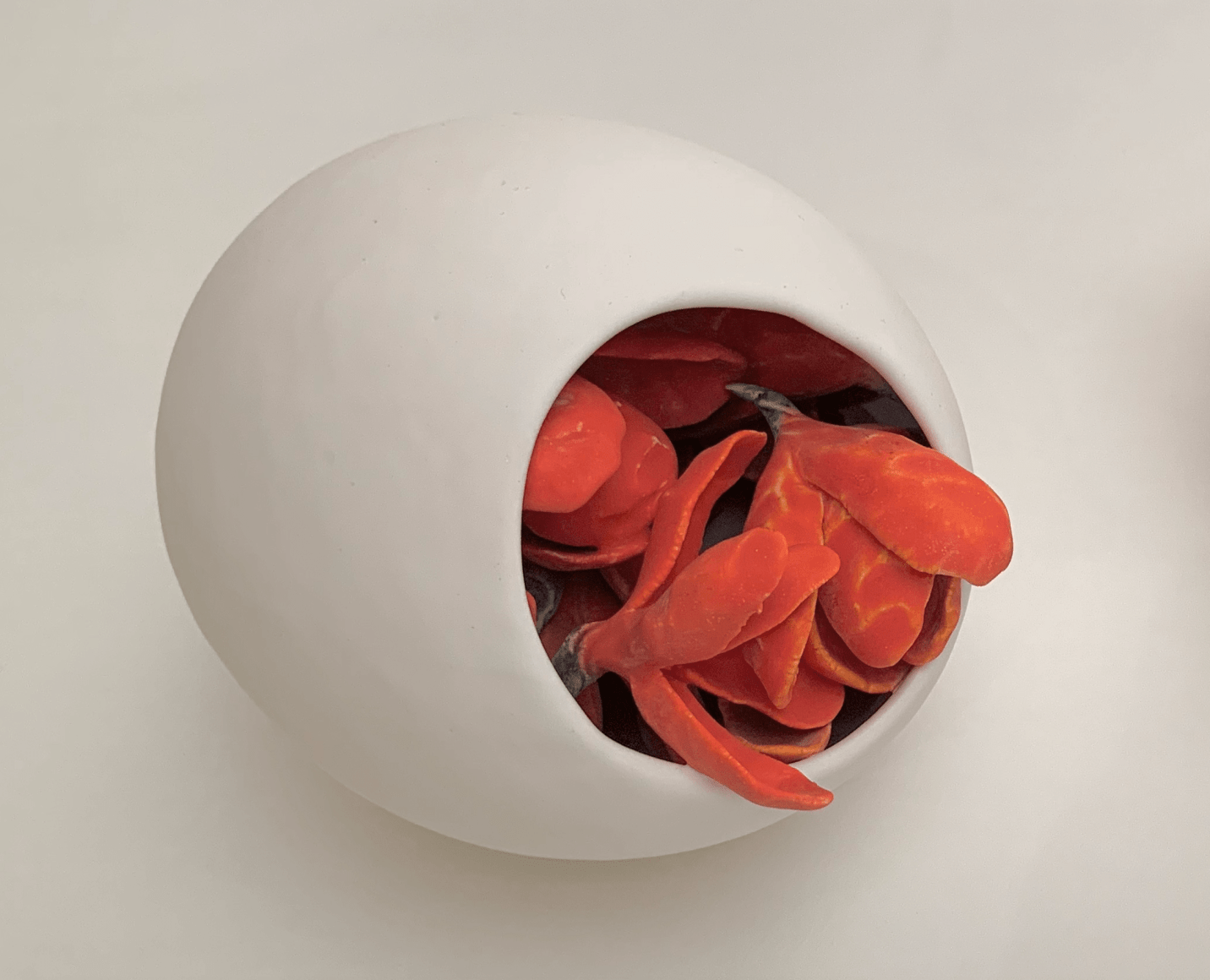 With compositions at once planned and intuitive, Sabin’s work is always reaching: pearly antlers branch out across walls; milky floral forms tremble, tumble, and fly; molten-glass hearts and eggs nestle within caged enclosures that look like mercury. Through the tangible touch of the maker, they bypass the distinction between human and natural. In a dialogue with historical ornament like Rococo swags and boiserie, or Art Nouveau arabesques, from eras when humans sought to subdue nature through flawless imitation and idealization, Sabin’s art instead merges human and natural in a jubilant carnival of mutuality.