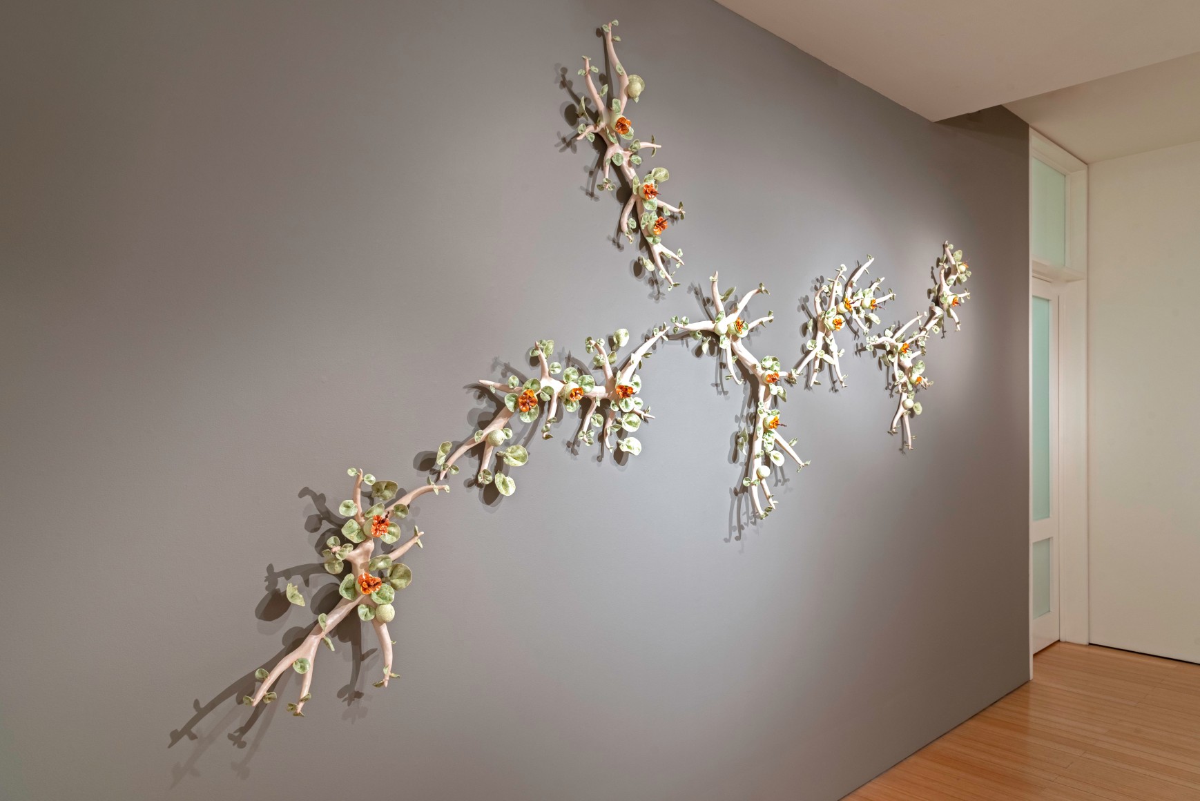 In Bradley Sabin’s writhing, flourishing, incandescent ceramic sculpture, clay, made of earth itself, becomes partially familiarized in its resemblance to natural form, and yet remains strange, wild, threading a vigorous, sinuous line between plant and animal, male and female, skin and viscera, natural and human-made. These forms (antlers, pods, leaves, blossoming fruit, snakes) at once emphasize those dualities and at the same time facilitate relationship, between each other as they interweave and hybridize, but also between themselves and the viewer. The work grows and spreads, seemingly limitlessly, taking over everything as nature eventually does, as the artist has noted. Sabin cradles the edge of that inundation between wild and civilized in his work, and performs the alchemy needed to translate it into form.