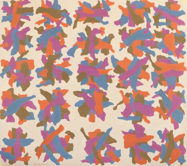 conquistadores (as in “The Apocryphal Aztec Portrait of Hernán Cortés”), all in Cundín’s signature visual vocabulary of floating gestures and color fields that suggest, but do not literally depict, figures and forms. A different, purely abstract trio of paintings features clusters of coalescing forms superimposed atop backgrounds of vivid color. In both bodies of work, the paintings share a sense of exuberance, intrigue, and gentle satire.