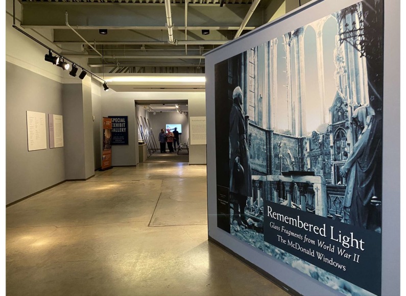 Remembered Light has traveled the country since 2007. The exhibit contains graphics explaining McDonald’s journey and includes a booklet of his stories, a lit display case of the remaining shards, various archives, and even a video produced by McDonald’s family in which he tells the story of his life and what he saw and felt during World War II.