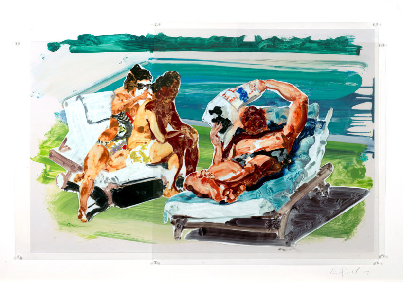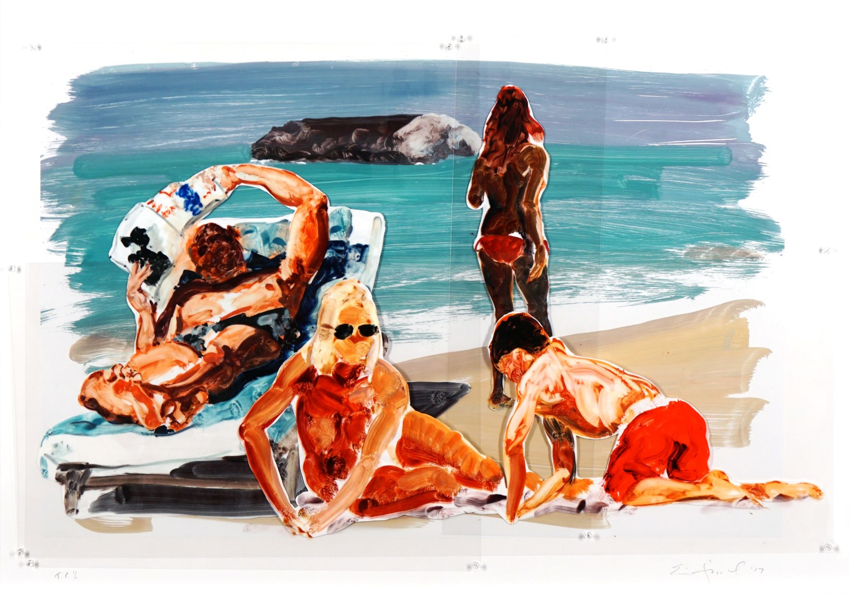 In the current exhibition, Fischl creates images that are both striking in their saturated tones and infused with the subtle tension of figures twisting, reaching, and pushing out beyond the boundaries of the picture plane. This work represents the latest in Fischl’s creative process. In the pinned Mylar and cast resin works the artist has re-imagined his technique used to create glassine collages in the late 70s and early 80s. Drawing on those early years, Fischl pulls his collage process forward using contemporary imagery and art-making technology not available to him in prior years. The result is work that is fresh, arresting, and deeply tied to the historic roots of the artist.