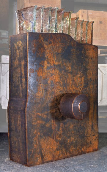 The sixteen-foot featured sculpture anchoring Koss’ seventeenth exhibition with the gallery offers the visitor a stark, quiet, reflective experience. “I have always wanted to create a piece that one can enter, contemplate, and have a quiet moment”, said Koss. When the viewer steps between the parallel walls of corten steel, Koss hopes the viewer will look up through the 350 blocks of cast glass and enjoy the elegant quietness. Koss and a team of six worked for three years to complete this piece. The main piece is a slight departure from the way Koss generally creates his monumental works. While most pieces come from site-specific inspiration, this piece came from a higher plane.
