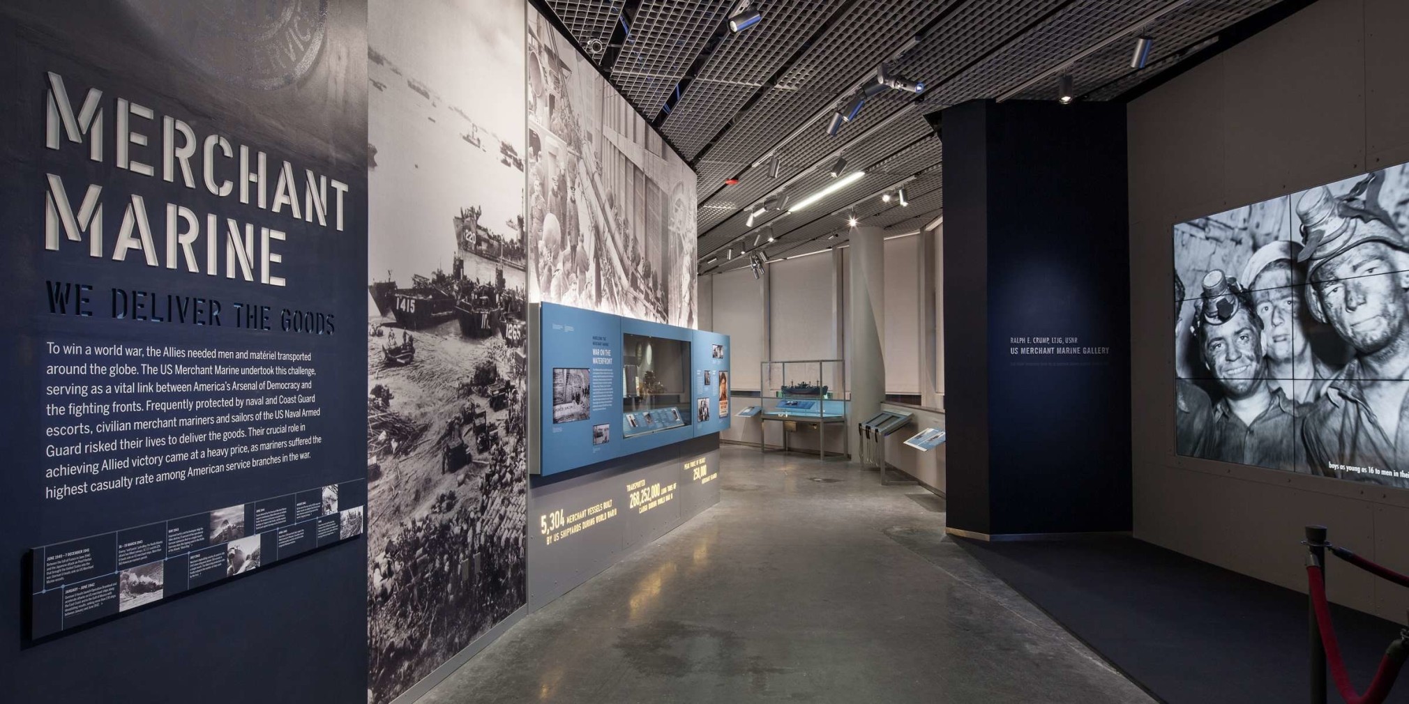 Situated at the end of the Horatio Alger Association American Spirit Bridge, this gallery honors the civilian merchant mariners who risked their lives transporting weapons, men, and matériel to US troops overseas. Members of the Merchant Marine were an essential force for the Allied cause, often working together with US Navy or US Coast Guard vessels to protect their precious cargo. Crossing the Atlantic and Pacific, they sailed under deadly threat of Japanese destroyers and German U-boats, which attacked as near as the Gulf of Mexico.
